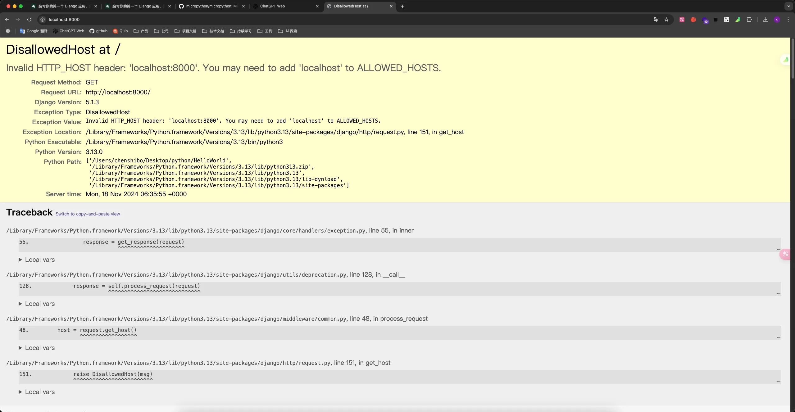 在 settings.py中找到 ALLOWED_HOSTS,将 localhost 加到数组中。