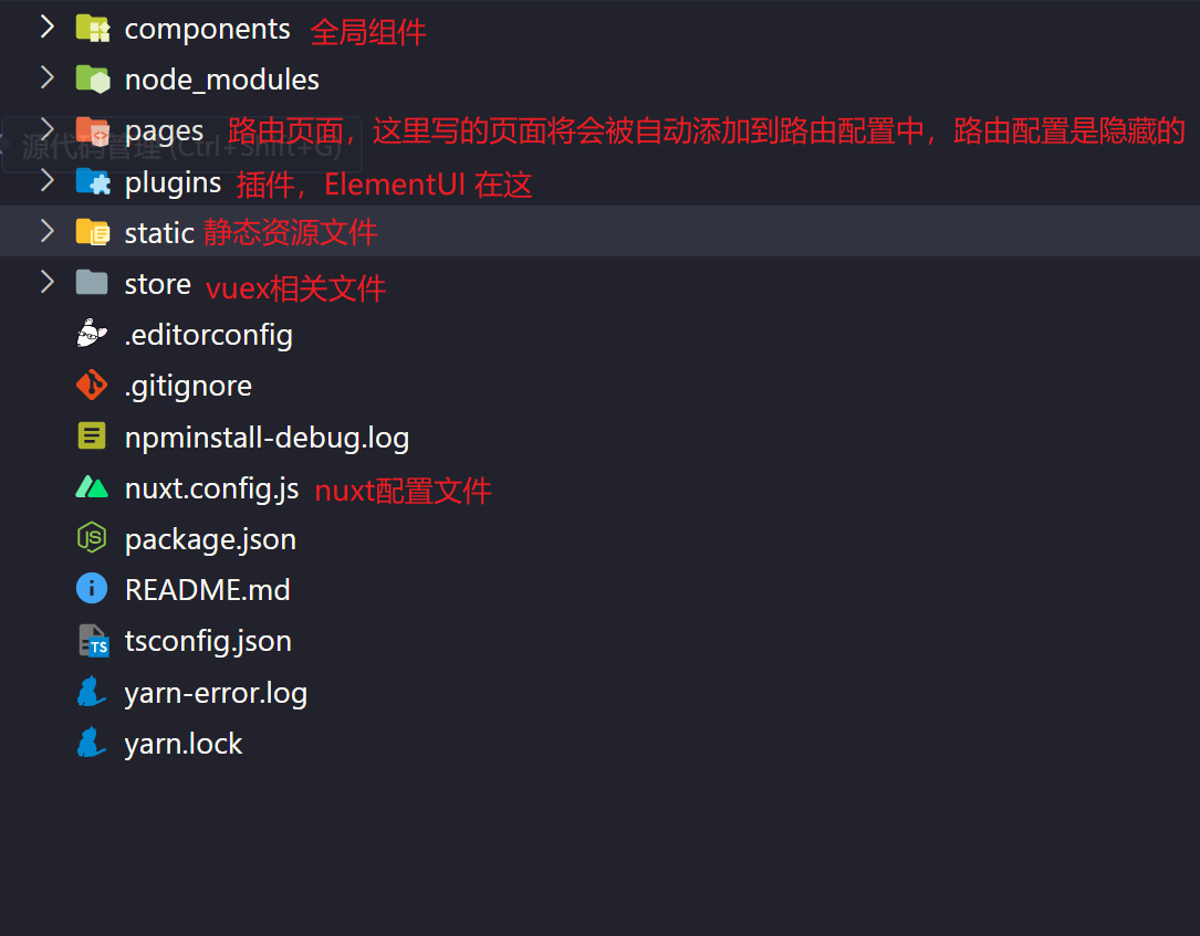 创建过程中,nuxt 会让我们在一些内容进行选择,按照自己喜好选择就好,生成项目结构如下: