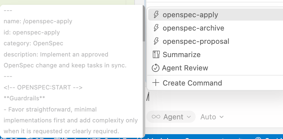 AGENTS.md存根。OpenSpec 会自动为您选择的工具配置斜杠命令,并且始终